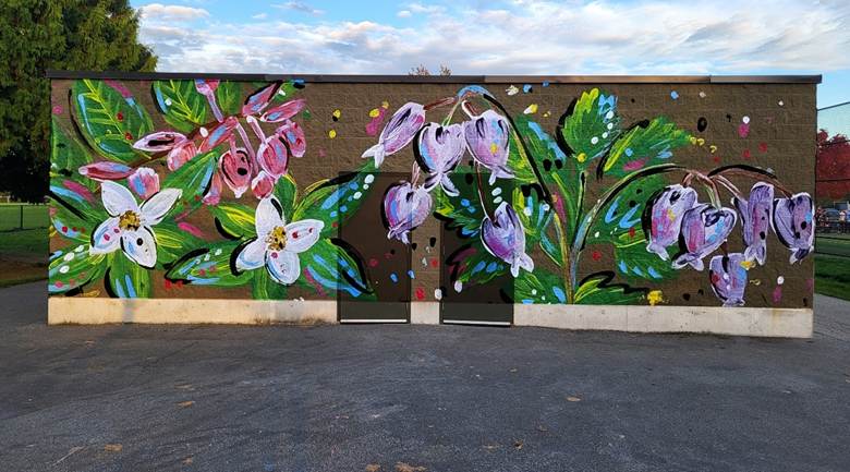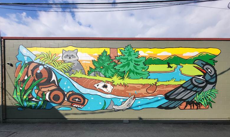 Figure 5: Mural completed as a mentee team artist under the direction of mentor, Chantelle Trainor-Matties, as part of the City of Abbotsford and the Reach’s CITI/SEEN project in September 2024. Located in downtown Abbotsford. The design was developed as a collaborative effort, with direction and final design decisions made by the mentoring artist. More information available at: https://youtu.be/GWbjsEu56N0?si=r9H6LvioSEYMXXo0