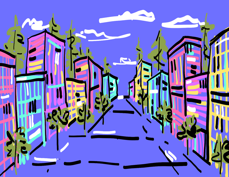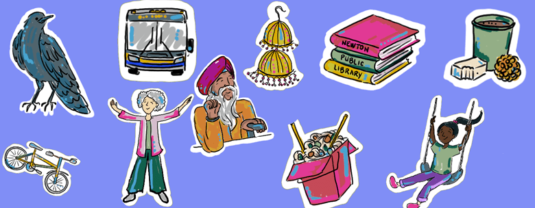 Figure 9: (From a previous submission to the City of Surrey, 2025) With a goal to represent this vibrant community, I propose to paint murals that celebrate playfulness and joy in common activities and sites, and evoke a sense of ownership and familiarity with the artwork. The illustrative style appears as “stickers” inspired by the loving practice of applying stickers to commonly used objects such as water bottles, laptops, backpacks and more. My proposed design intends to spark a little bit of cheer while visitors pass by or sit to rest throughout their busy days. I want viewers of the paintings to feel the street itself belongs to them. Subject matter for the images includes diverse representation of residents, recognizable places, local animals and plants, and depictions of local business offerings (e.g. cuisine, services, etc.) but I remain open to feedback and suggestions for specific image inclusion.