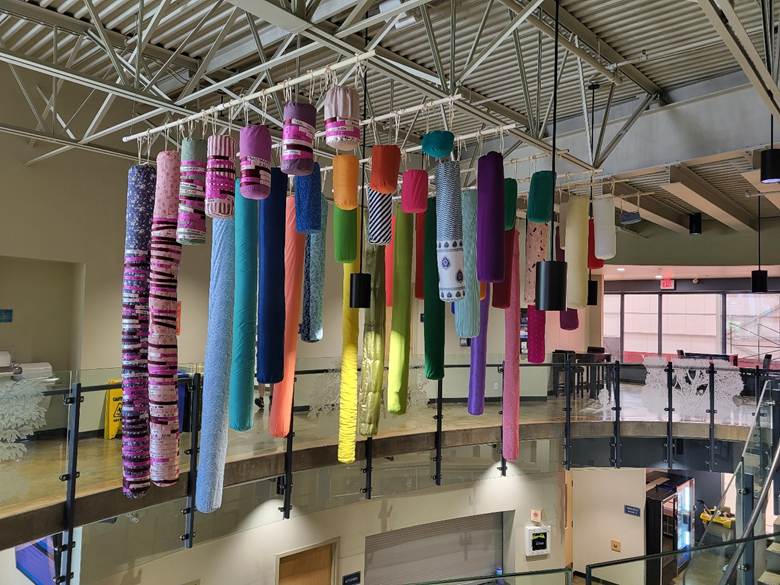 Figure 1: Current solo public art project for the City of Nanaimo, titled Histogram Histories, installed in June 2025. Histogram Histories is a dynamic hanging installation representing graphs tracing the change in seven metrics across the City of Nanaimo through time, installed in the atrium of the Oliver Woods Community Centre. Lightweight fabric cylinders representing the metrics hang in a series of sculptural ‘graphs’, affording visitors multiple viewpoints and changing perspectives, wherein they experience the selected statistical data in visually-arresting artistic form. More information available at https://kiranjotart.com/histogram-histories/