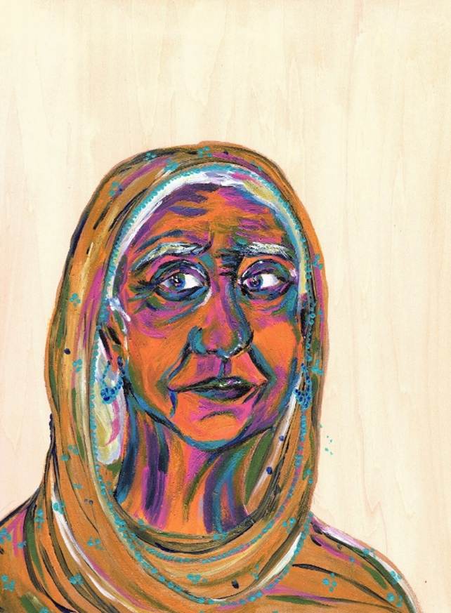 Figure 21: Surajmukhi, 12″x16″ Acrylic on wood panel, from the series, “Darshan.” Darshan, the name of my maternal grandmother, from Panjabi, translating as “a vision of Divinity”. The artworks, which are a series of portraits of women began as an anonymous identity and have continued as a celebration of maternal lineage and melanin-rich women.