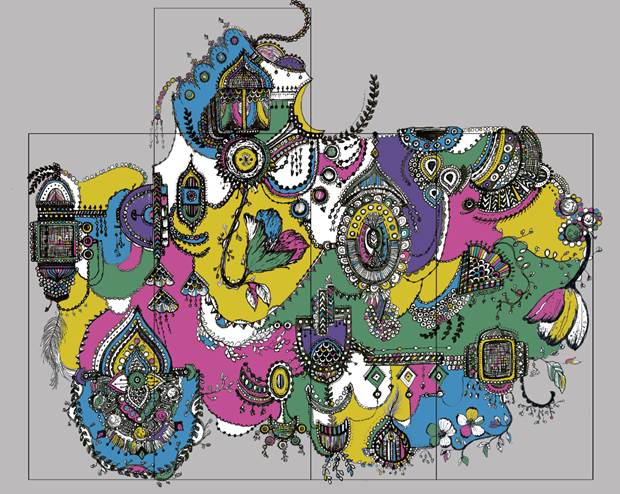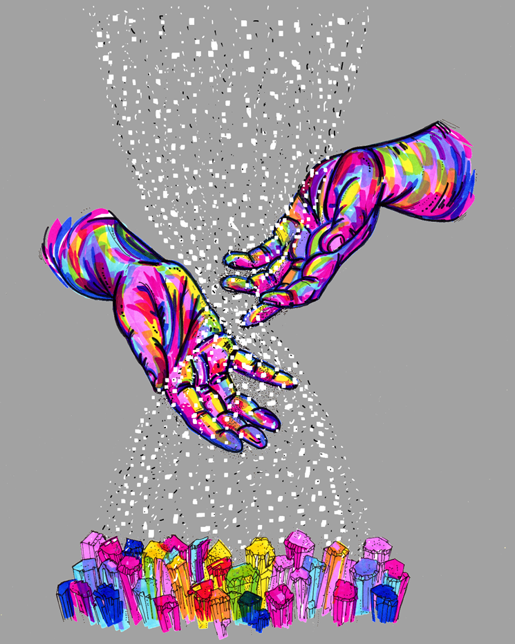 Figure 8: “Heera” original handmade artwork with marker on paper, re-envisioned here as a mural concept. Speaking to the potential diamonds we allow to slip through our fingers as time goes on. Inspired by a shabad from Sikh scripture.
