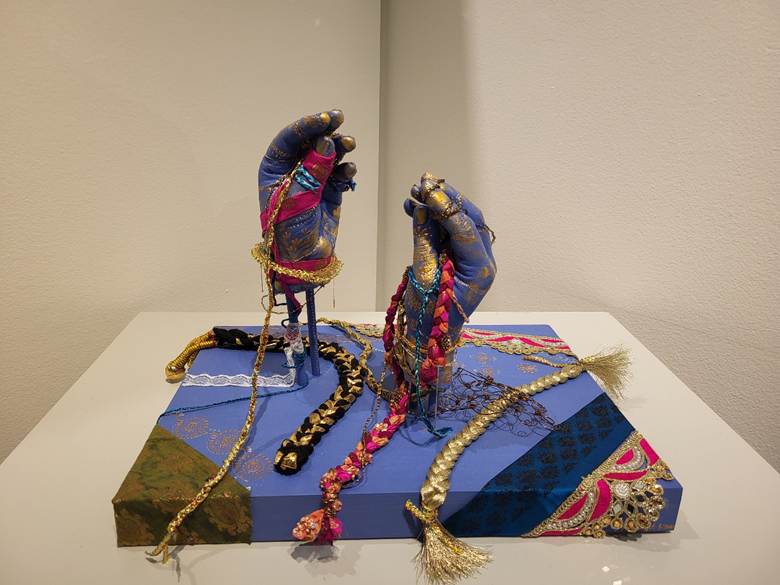 Figure 3: Recent solo exhibition at the Chilliwack Museum & Archives. Sculpture titled Through Fingers. Plaster, wood panel, wires, parandia, silk, trims, 16”x12”x12”, 2025.